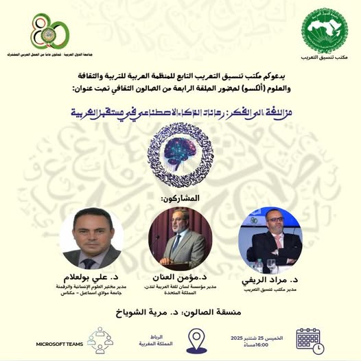 استضاف مكتب تنسيق التعريب التابع للمنظمة العربية للتربية والثقافة والعلوم (الألكسو) بالرباط، يوم الخميس 26 سبتمبر 2025، الحلقة الرابعة من صالونه الثقافي الشهري تحت عنوان: «من اللغة إلى الفكر: رهانات الذكاء الاصطناعي ومستقبل العربية»، بمشاركة الأستاذ الدكتور مؤمن العنان، مدير مؤسسة لسان للغة العربية بلندن، والأستاذ الدكتور علي بولعلام، أستاذ التعليم العالي ومدير مختبر العلوم الإنسانية والرقمنة بجامعة مولاي إسماعيل بمكناس.