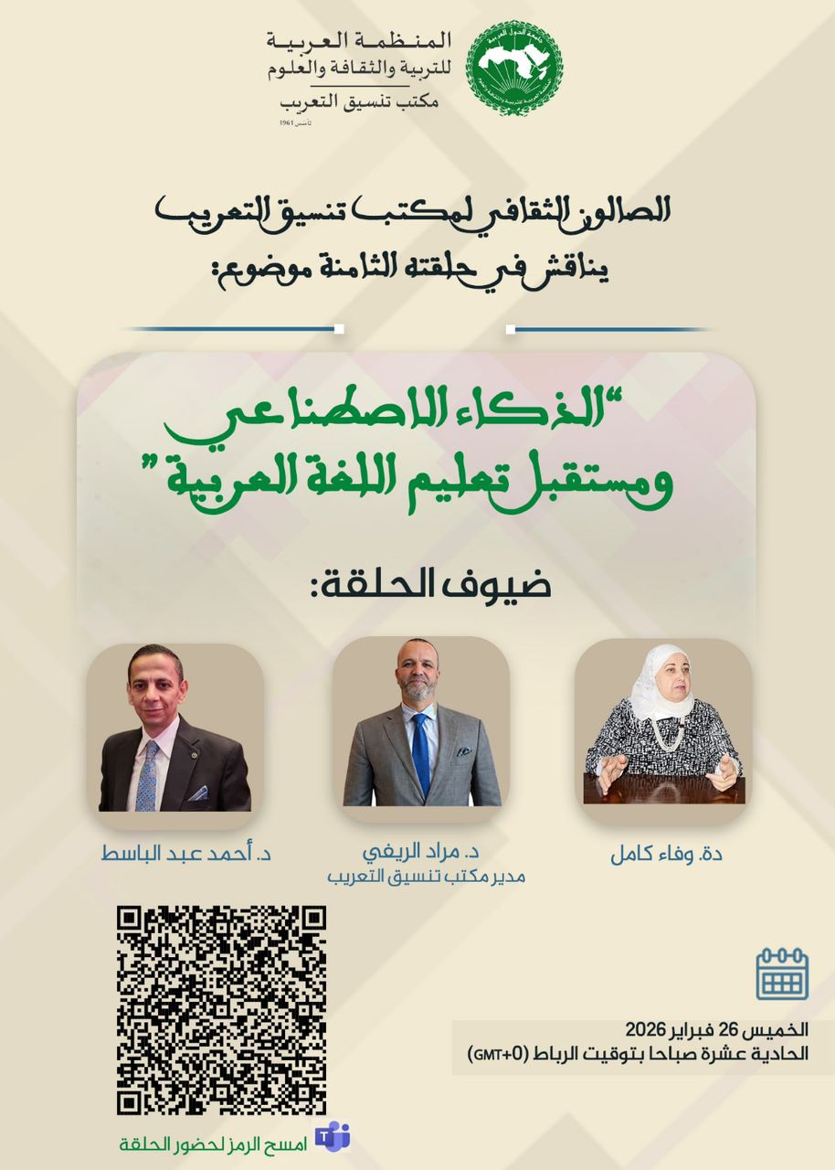 في إطار برنامجه الثقافي الهادف إلى تعزيز البحث العلمي وتشجيع التبادل المعرفي في مجالات اللغة العربية والمعجمية والتعريب؛ نظم مكتب تنسيق التعريب التابع للمنظمة العربية للتربية والثقافة والعلوم (الألكسو) الحلقة الثامنة من صالونه الثقافي، التي خُصصت لموضوع «تطبيقات الذكاء الاصطناعي ومستقبل تعليم اللغة العربية».