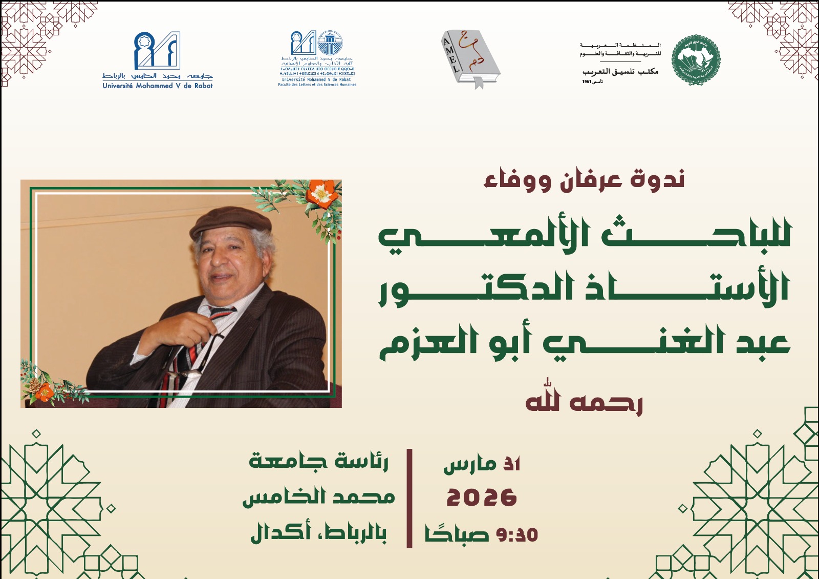 عقد مكتب تنسيق التعريب بالرباط بمدرج محمد بن عبد الجليل برئاسة جامعة محمد الخامس، بالتعاون مع الجمعية المغربية للدراسات المعجمية وجامعة محمد الخامس بالرباط، صباح الثلاثاء 31 مارس 2026، ندوة علمية تكريمية بعنوان “عرفان ووفاء”، خُصصت للاحتفاء بالمسار العلمي والأدبي للمرحوم العلامة الدكتور عبد الغني أبو العزم.